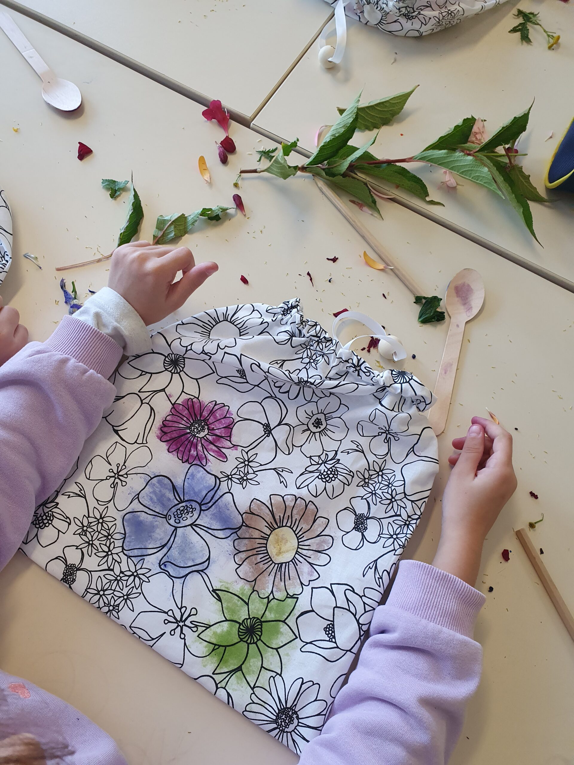 Nous viendrons grâce aux pigments des fleurs colorier une création en tissus de votre choix ( voir lors de la réservation): un marque page , un sac à goûter, un set de table…